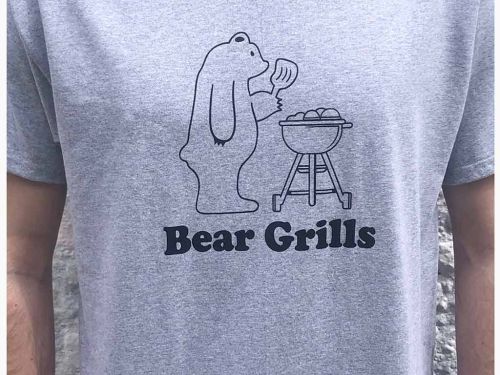 Featuring a bear at the bbq (Bear Grills), this Funny T-shirt is in stock in sizes small, medium, large and extra large