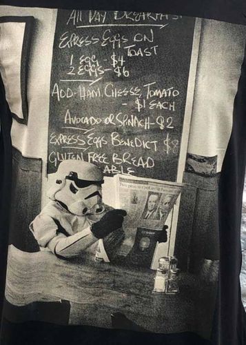 We have a range of unusual Quirky T-shirts and this item picture a stormtrooper enjoying Breakfast at Joe's available in a range of sizes