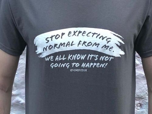 Make a statement Stop expecting normal from me is written on this Quirky T-shirt available in a range of sizes to fit